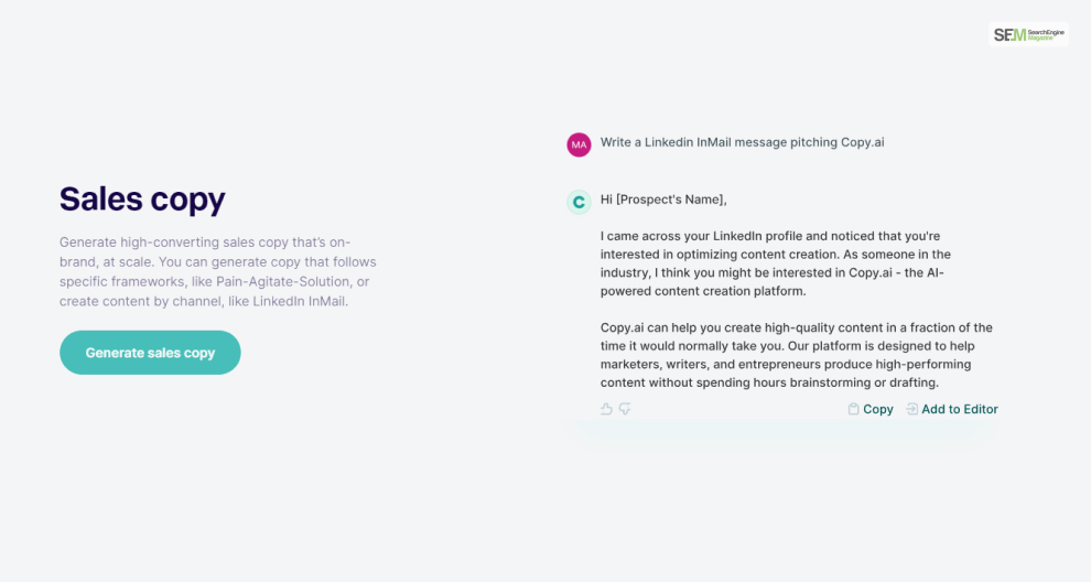No matter which platform you decide to pitch your brand through – be it through emails or using LinkedIn – Copy AI will pitch it right. It has a great way of getting the point across with a pitching framework (like Pain-Agitate-Solution).